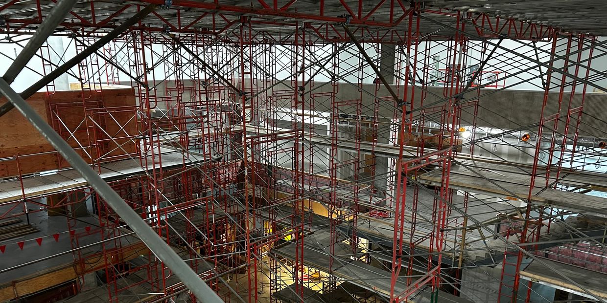 Infinity Scaffold designed and installed a massive frame scaffolding dance floor that provided full perimeter and ceiling access. The scaffold set had working deck levels every seven feet to accommodate the entire space. Small rolling scaffold sets were then created at the top of the dance floor to give easier access to the skylights.