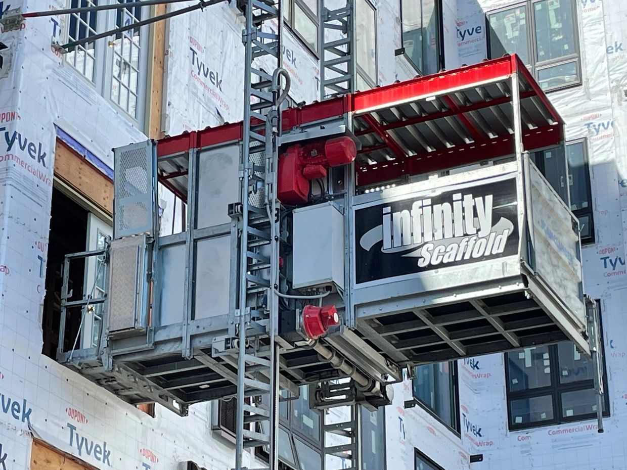 Take our transport platform downtown for high rise facade work. Max lifting height with a tied mast is 330 feet.